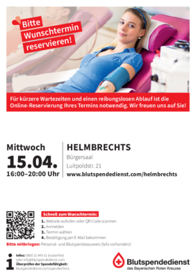 Der nächste Blutspendetermin findet am Mittwoch, den 15. April 2026 im Helmbrechtser Bürgersaal (Luitpoldstraße 21) statt.