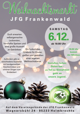 Die JFG Frankenwald lädt Sie herzlich zu ihrem ersten Weihnachtsmarkt auf dem Vereinsgelände in Oberweißenbach ein. Sie erwarten selbstgemachte Leckereien, herzhafte Speisen und eine große Auswahl an Getränken. Zudem präsentieren verschiedene Aussteller handgemachte Geschenkideen und schöne Dinge zum Entdecken!