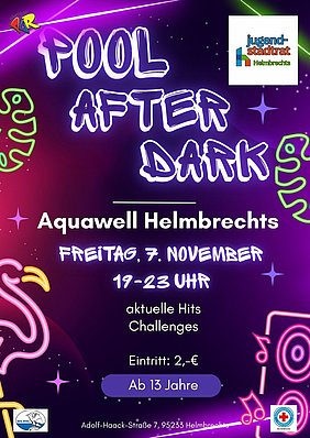 Der Jugendstadtrat Helmbrechts lädt zum POOL AFTER DARK am Freitag, den 7. November (Herbstferien) ins Wellenhallenbad Aquawell ein. Von 19 bis 23 Uhr erwarten euch neben aktuellen Hits aus den Charts auch eine „Challenge“ der etwas anderen Art. Alles Weitere bleibt eine Überraschung und wird noch noch nicht verraten.